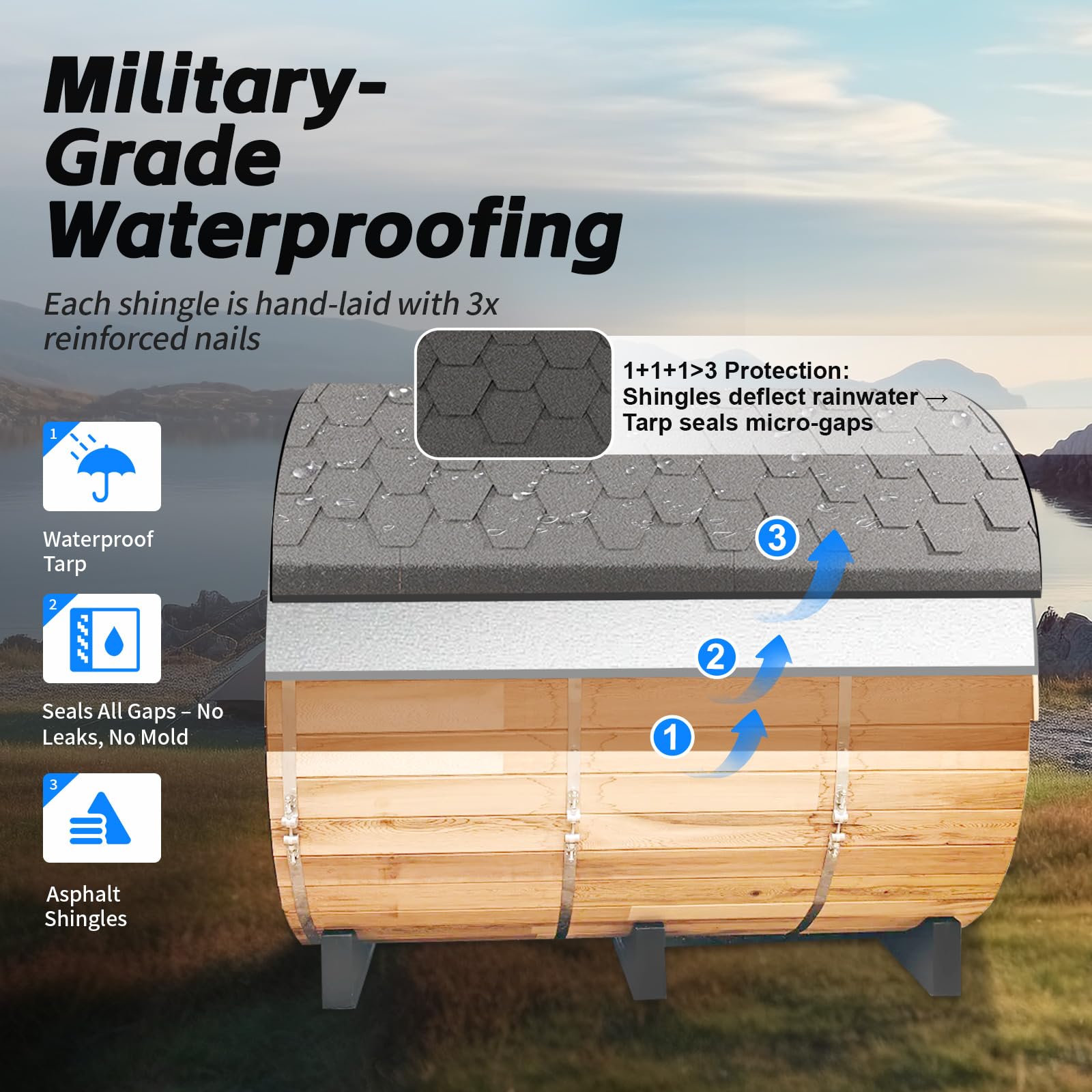 Waterproofing System: Precision-fit wooden panels – handcrafted with seamless joinery & airtight silicone seals to block moisture intrusion. Architectural asphalt shingles with high density roofing underlayment double protection, longer lifespan than single-layer roofs